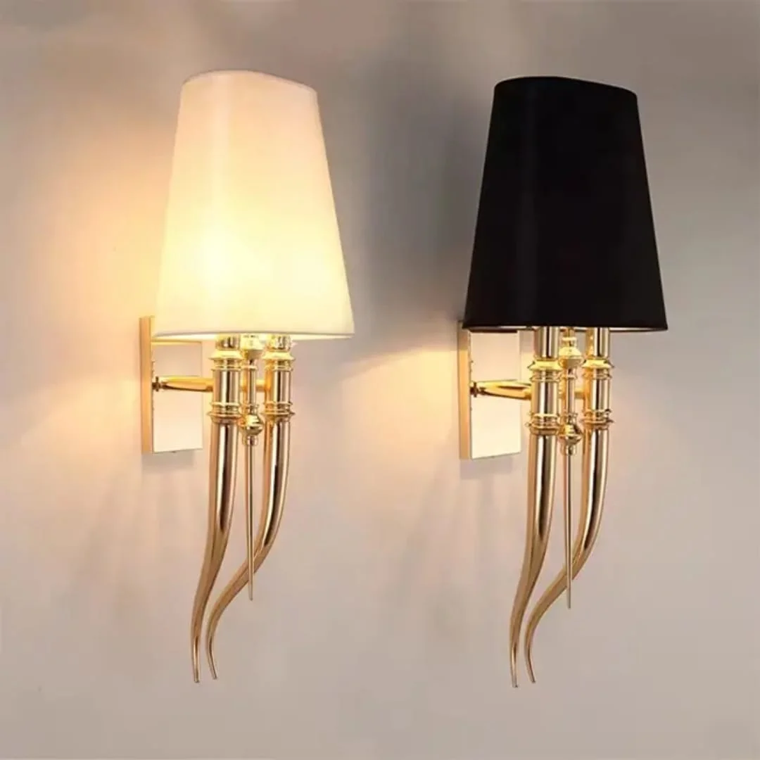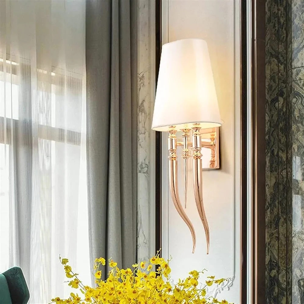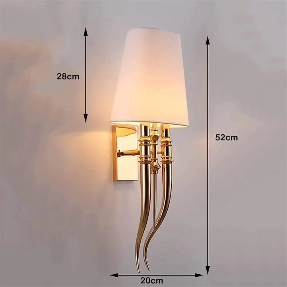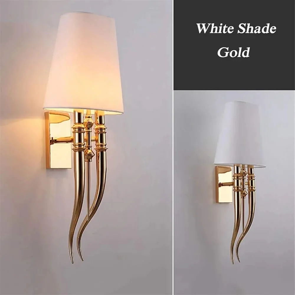 Enhance your home decor with the Gold Finish Base White Fabric Lampshade Wall Lamp. This exquisite sconce fixture, perfect for living rooms, bedrooms, and bedsides, boasts a timeless antique brass finish and amber glass design. It casts a warm white light, creating a cozy and nostalgic atmosphere. Ideal for adding vintage charm to any space.
