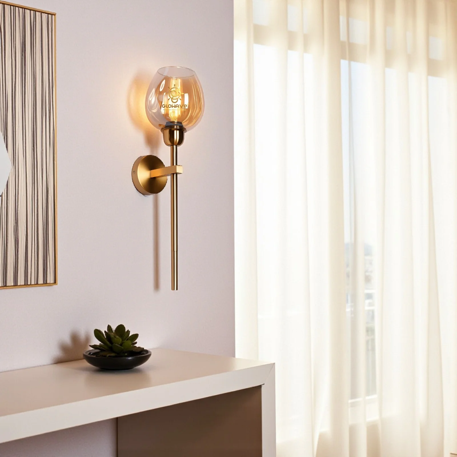 Elevate your living space with the Modern Gold Finish Metal Body Amber Glass Shade Wall Lamp. This elegant lighting fixture, perfect for your living room, bedroom, or bedside, features a sleek grey finish and contemporary glass design. It provides a warm white glow that creates a cozy ambiance.