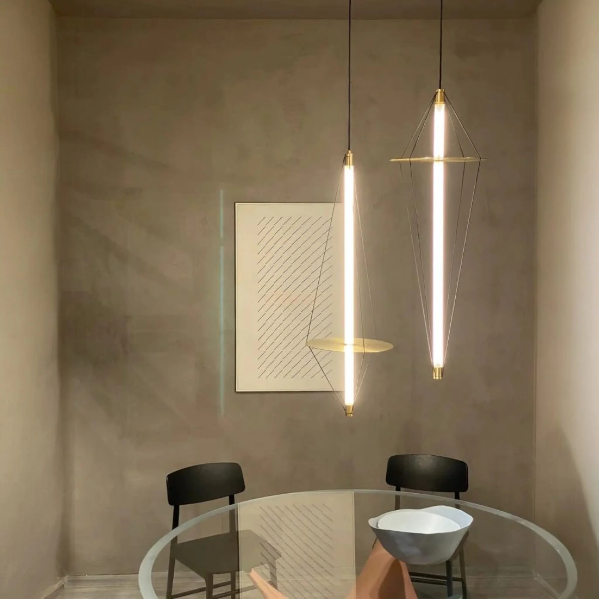 - Modern Designer Pendant Light – Elegant geometric wire-frame design with a slim vertical LED tube, adding a contemporary and artistic touch to premium interiors.