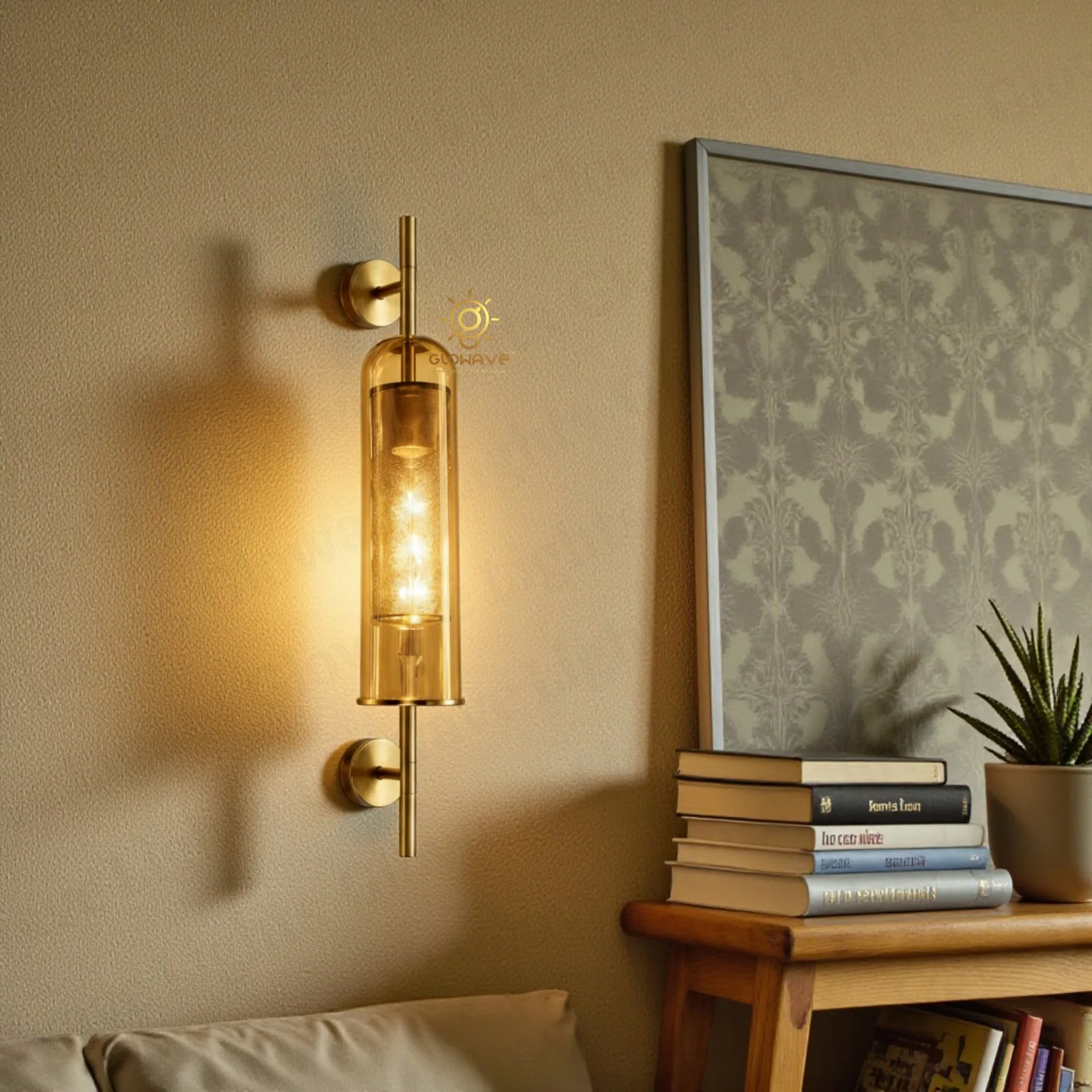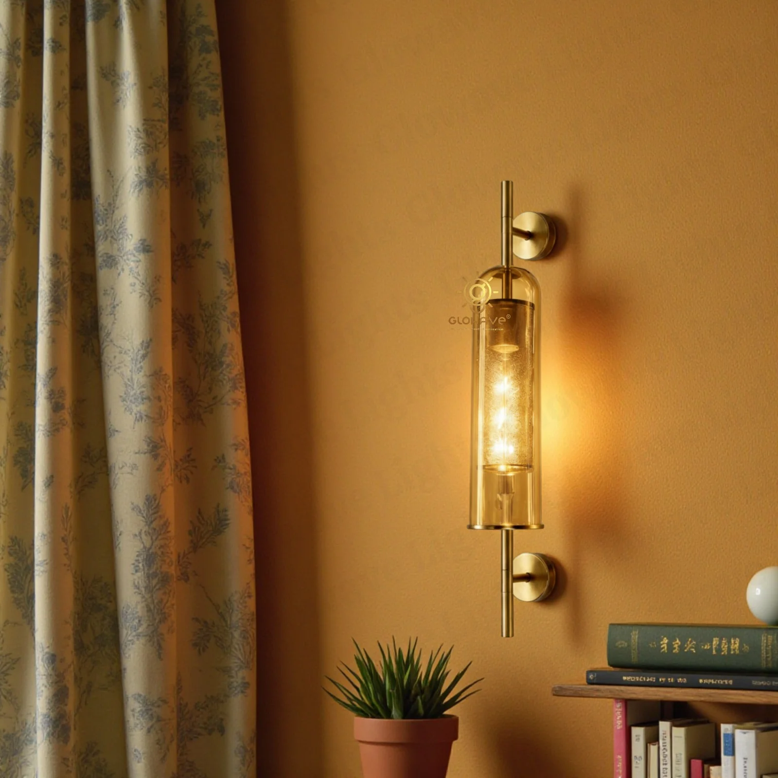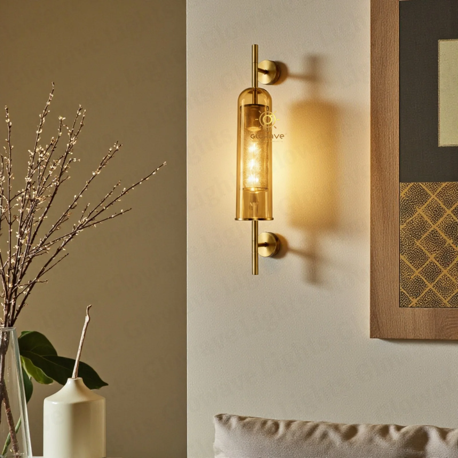 Elevate your interior décor with this modern luxury brass wall sconce, designed to create a warm and sophisticated ambience. Featuring a premium gold/brass finish frame and an elegant Amber glass cylindrical shade, this wall light delivers a rich, diffused glow that enhances both contemporary and classic interiors.