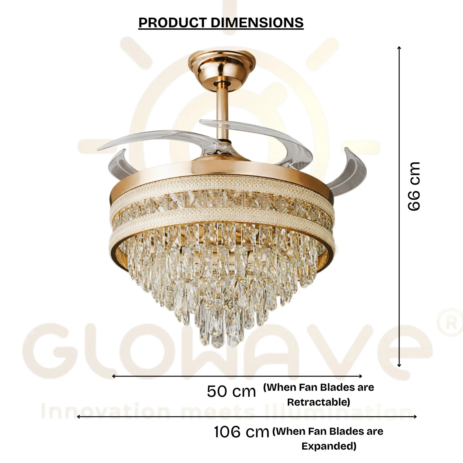 Bring together luxury lighting and smart air circulation with this Crystal Retractable Ceiling Fan with LED Chandelier Light. Designed to make a statement, this fan features elegant crystal detailing, a rich gold finish, and invisible retractable blades that seamlessly fold away when not in use—transforming the fan into a stunning chandelier.