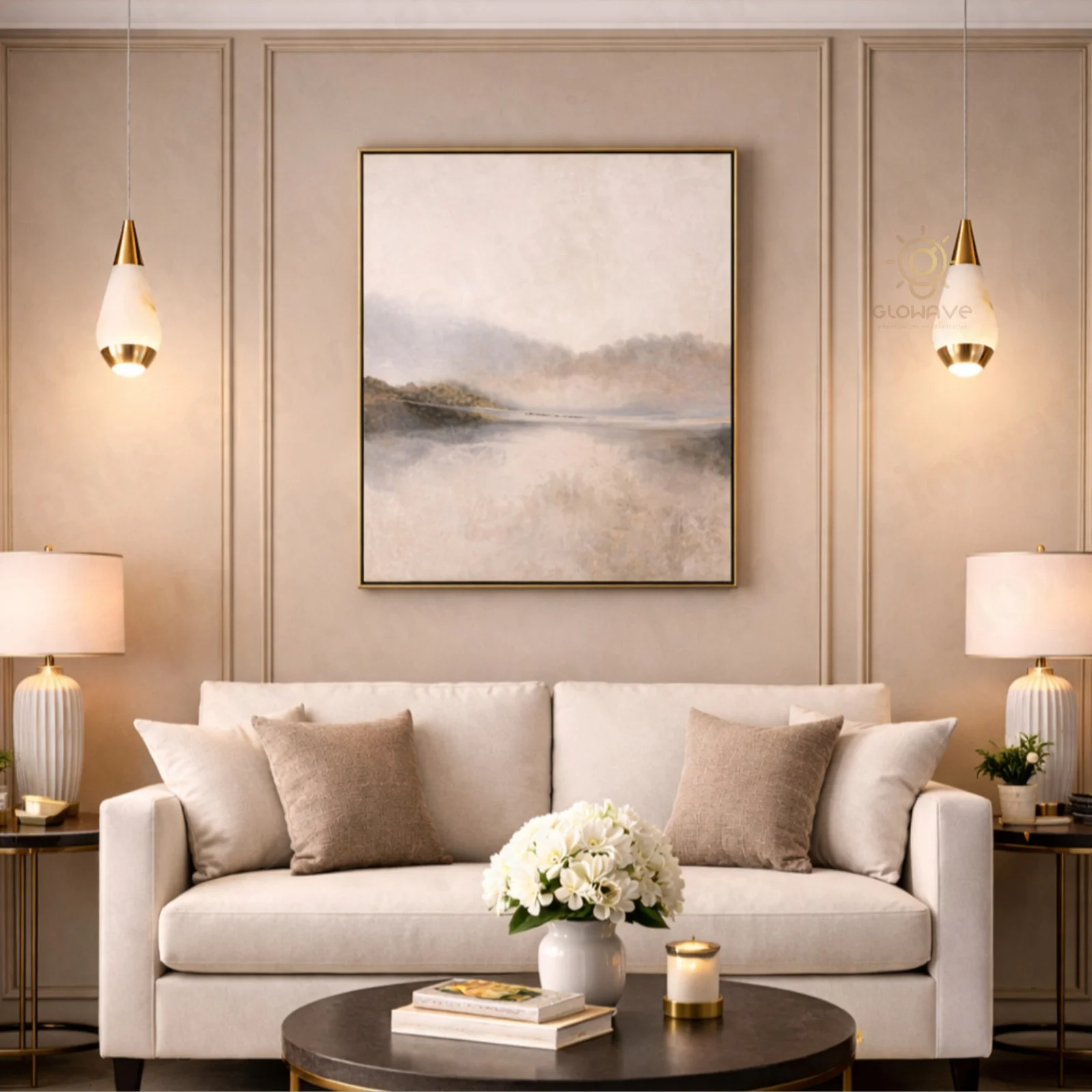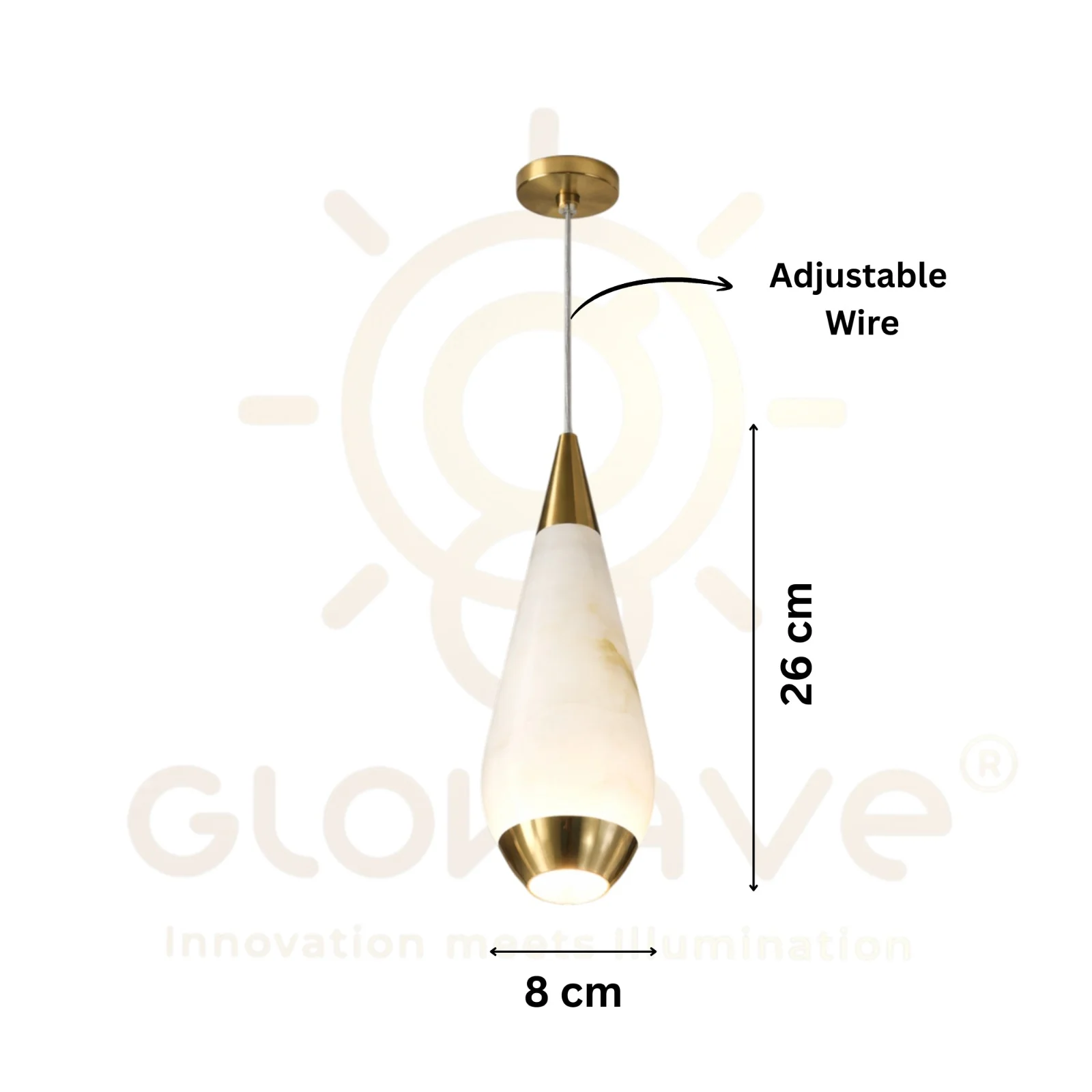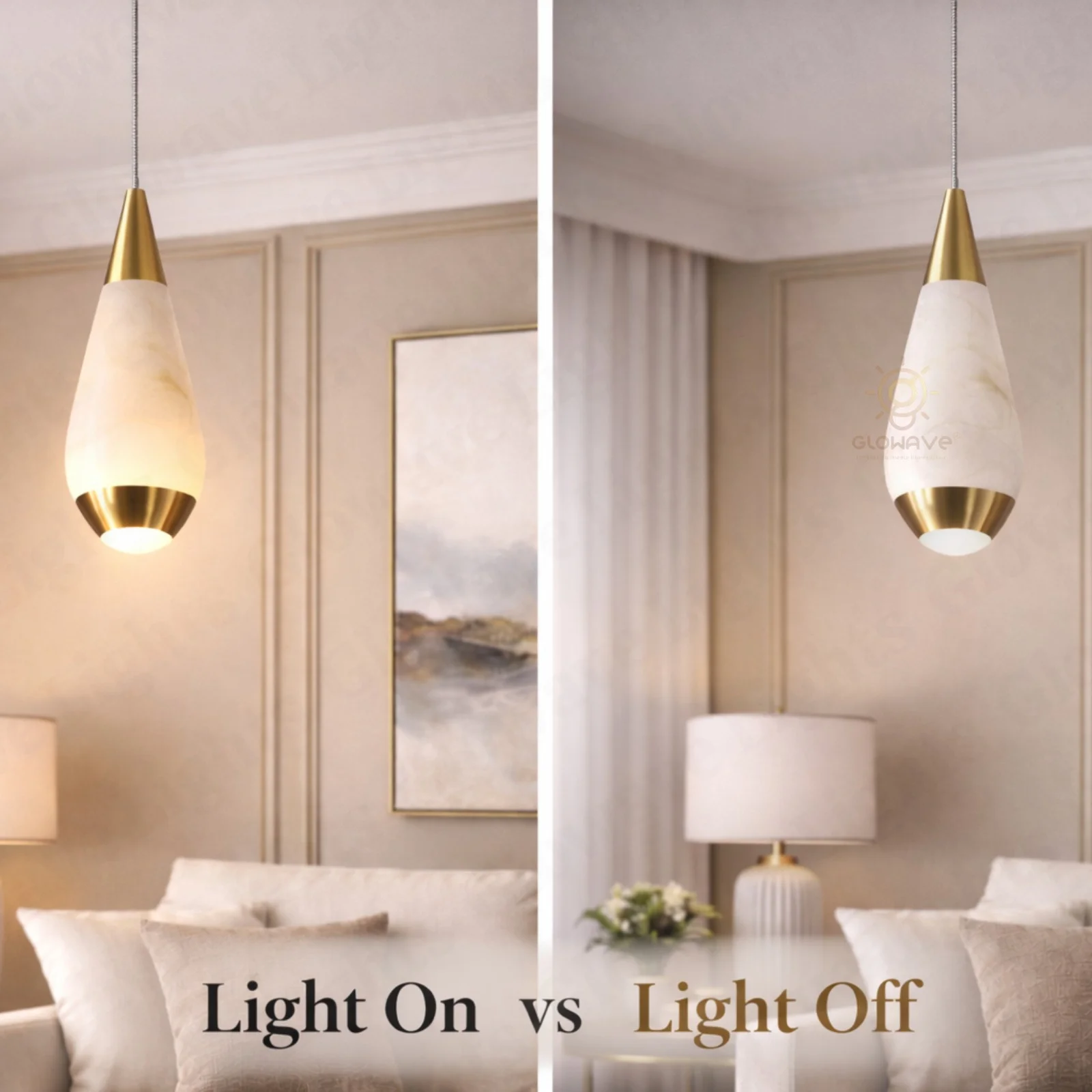 The natural marble shade creates a soft, diffused glow while the integrated bright downlight provides focused illumination—perfect for dining tables, bedside areas, kitchen islands, and accent corners. The brass-finish canopy and detailing add warmth and contemporary appeal, making it ideal for modern, minimal, and luxury interiors.