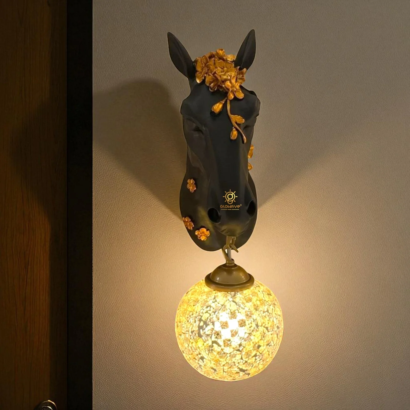 Illuminate your space with the Royal Horse Head Resin Black Wall Lamp, perfect for living rooms, bedrooms, and bedsides. This exquisite warm white lamp features a majestic horse head design, adding a touch of luxury and elegance to any decor. Crafted from high-quality metal with a stunning Black finish, it provides a warm, inviting glow that enhances the ambiance of your home. Ideal for those seeking a blend of sophistication and functionality, this wall lamp is a statement piece that elevates your interior design.