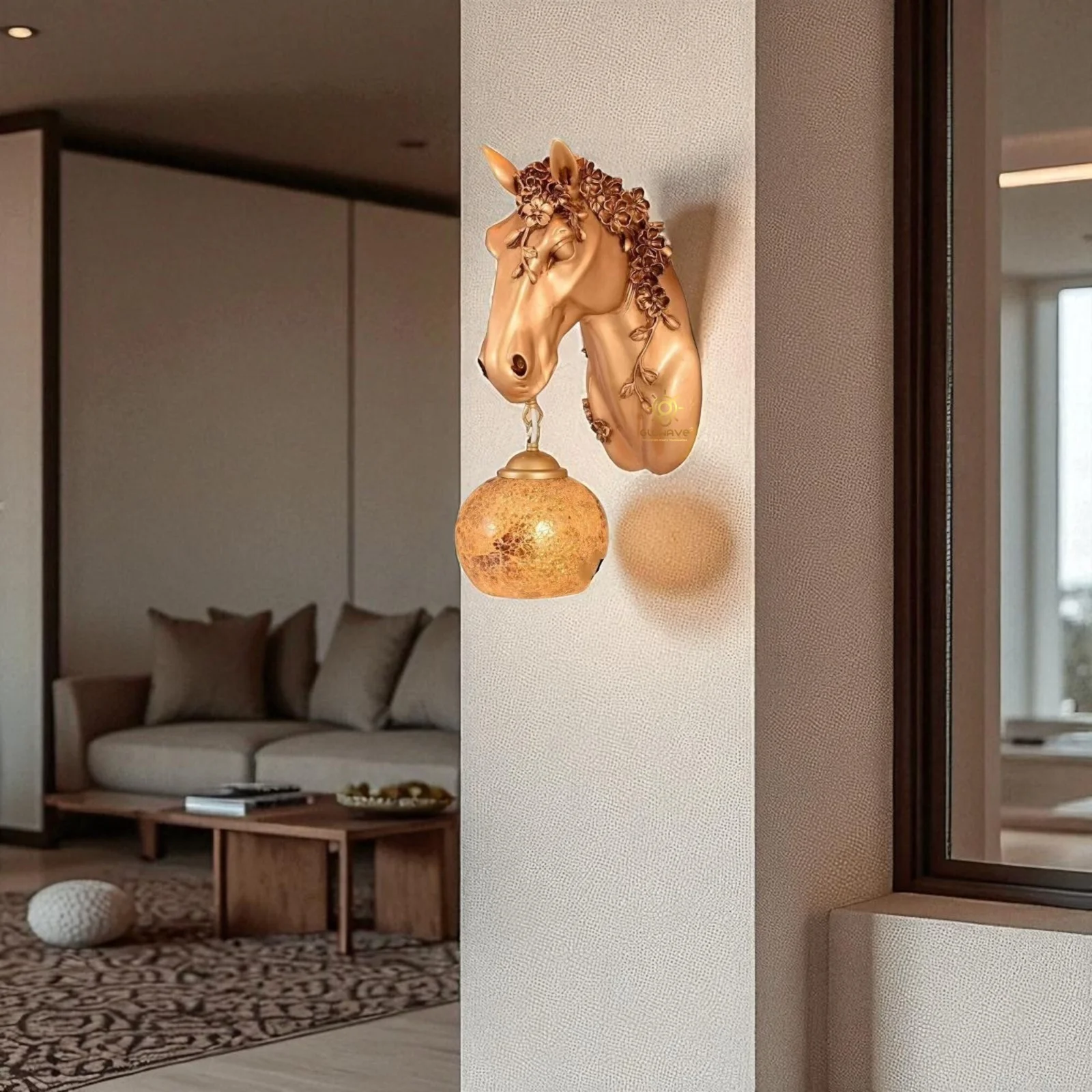 Illuminate your space with the Royal Horse Head Resin Golden Wall Lamp, perfect for living rooms, bedrooms, and bedsides. This exquisite warm white lamp features a majestic horse head design, adding a touch of luxury and elegance to any decor. Crafted from high-quality metal with a stunning golden finish, it provides a warm, inviting glow that enhances the ambiance of your home. Ideal for those seeking a blend of sophistication and functionality, this wall lamp is a statement piece that elevates your interior design.