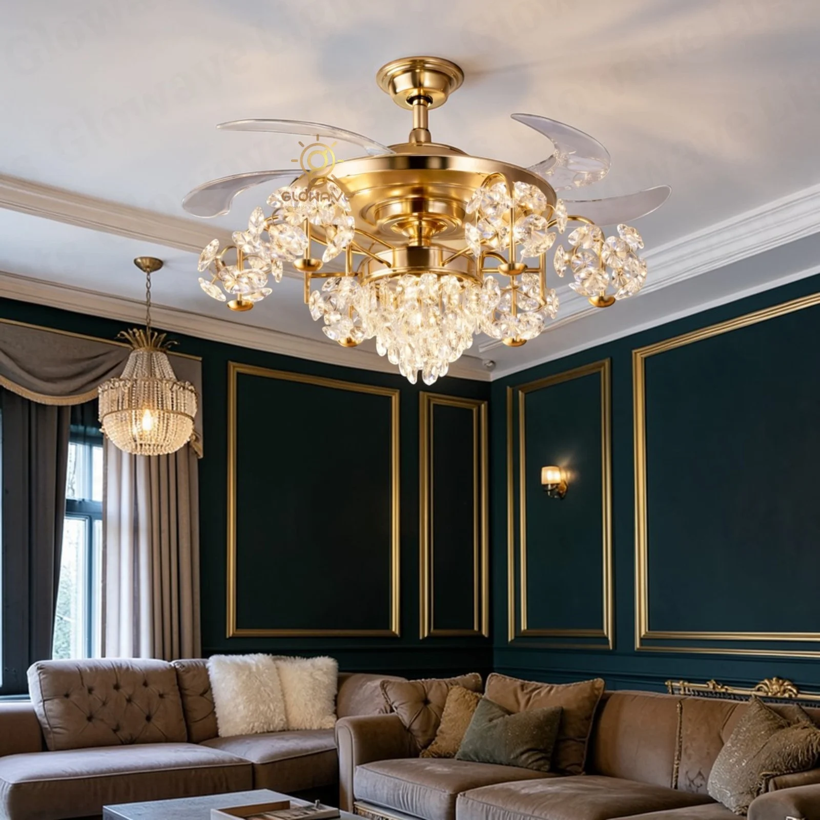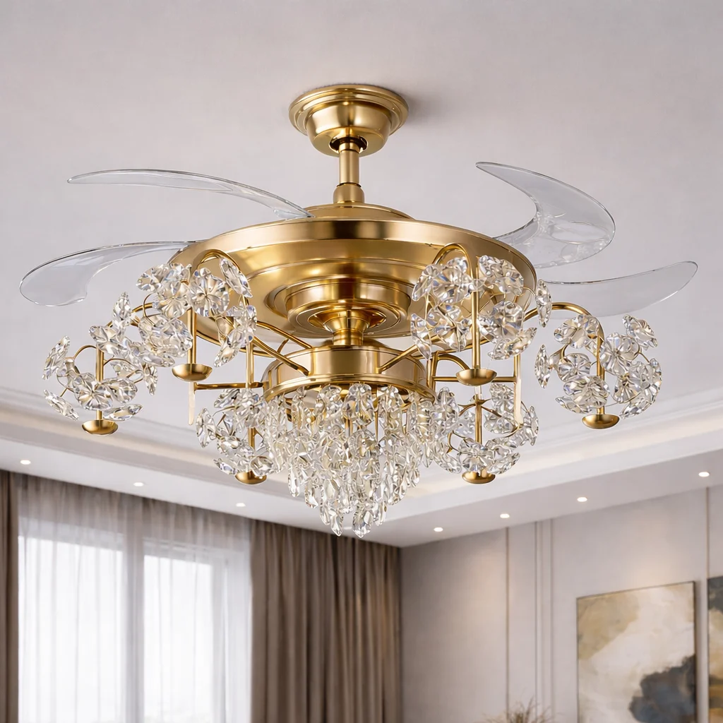 Luxury Gold Crystal Retractable Ceiling Fan with LED Chandelier Light - Tricolor