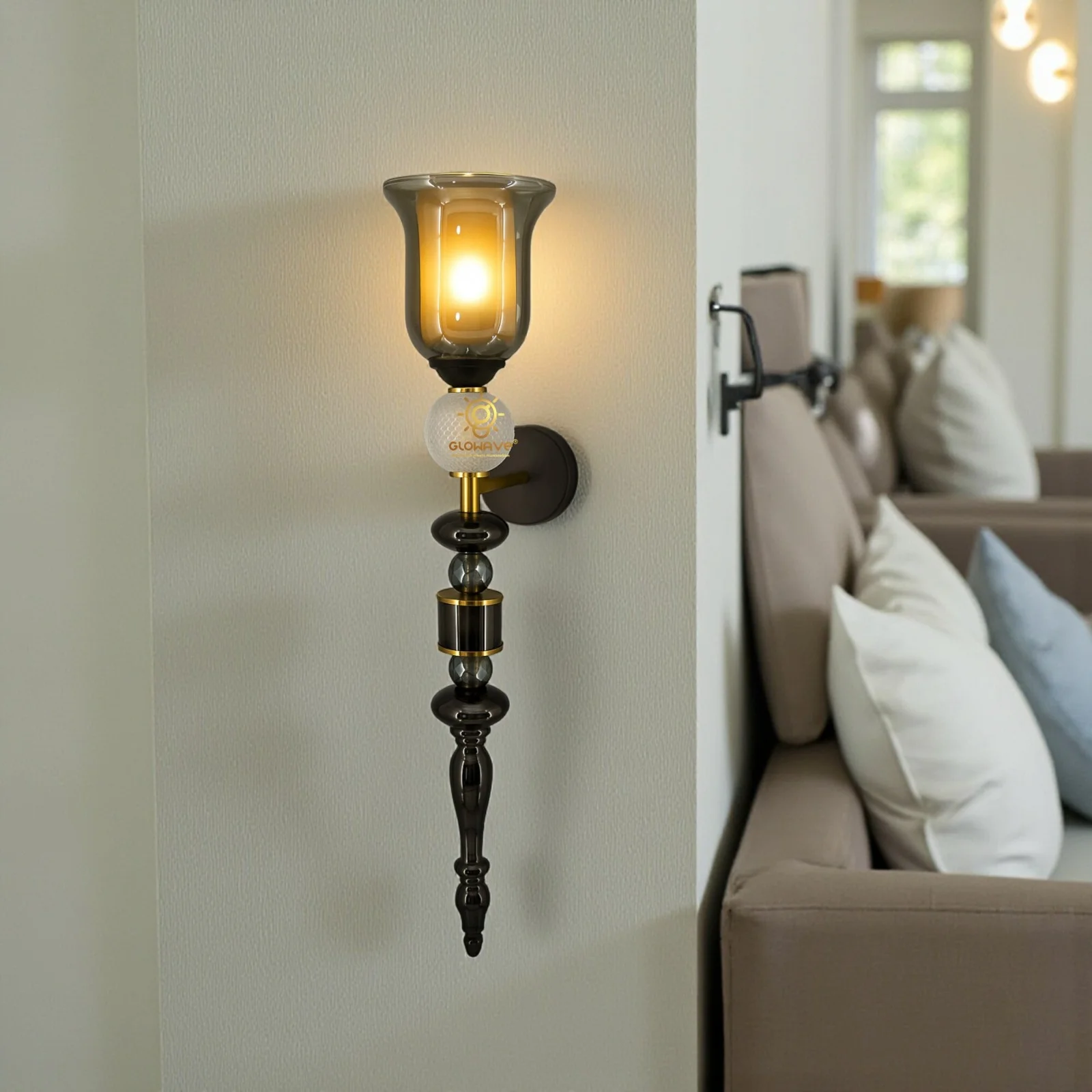 - Stylish Design: Black Finish Smoky Crystal Column Round Base Wall Sconce.