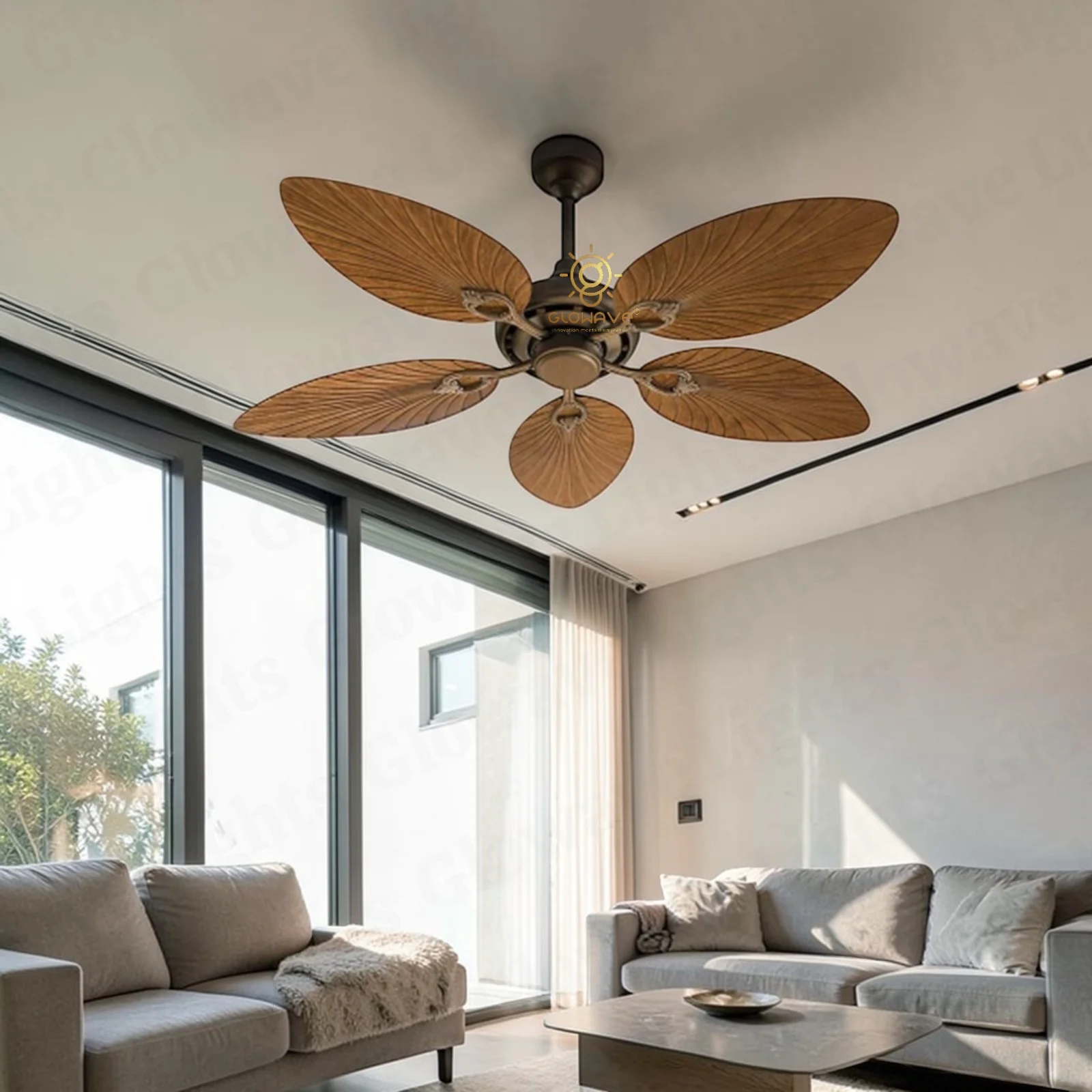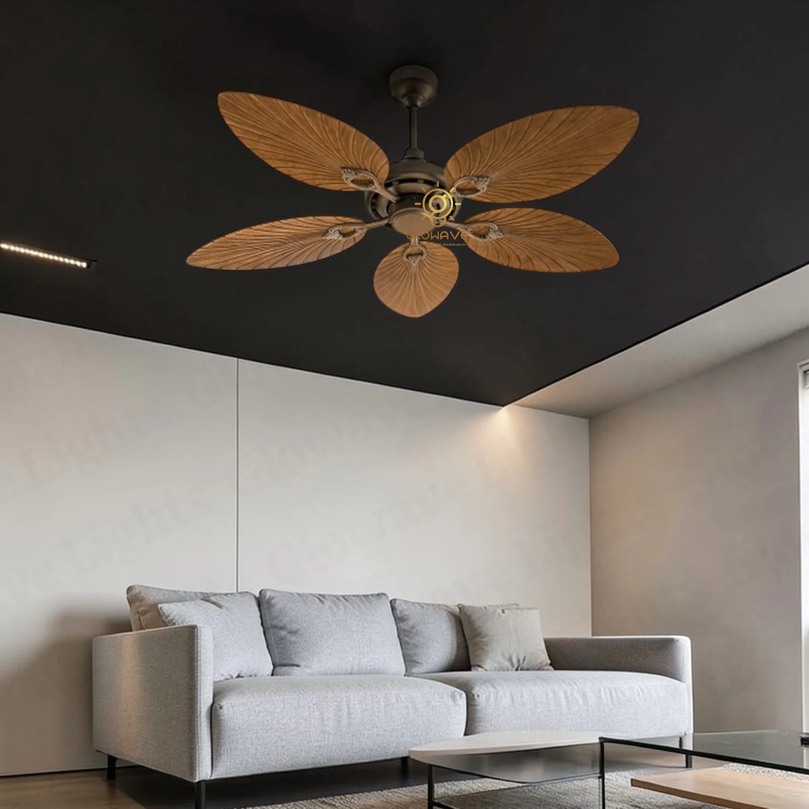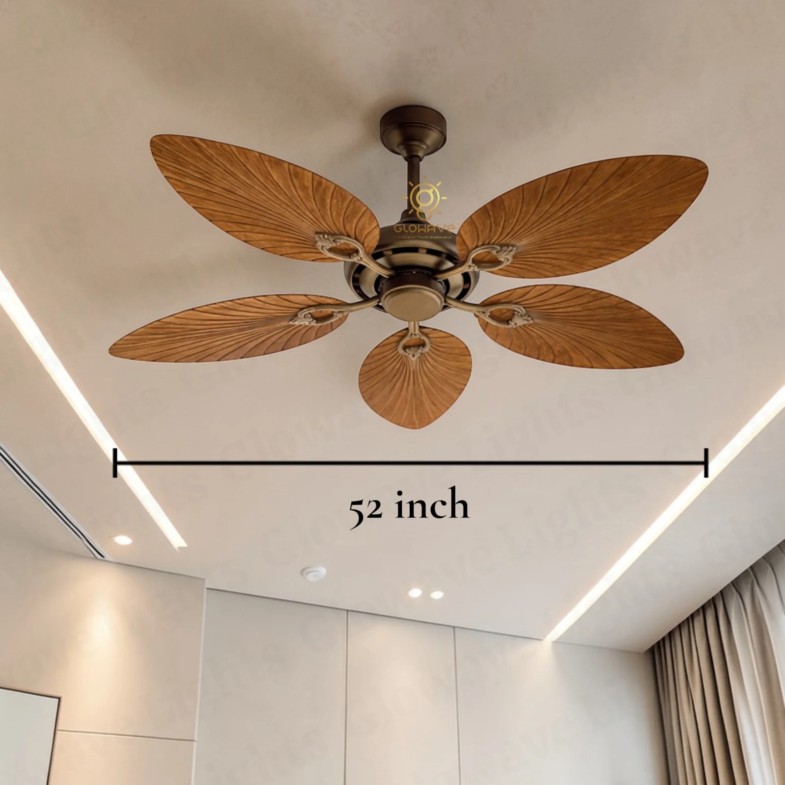 Tropical Leaf Design Ceiling Fan with Wooden Finish Blades Decorative Fan with Reversible Motion Remote Control