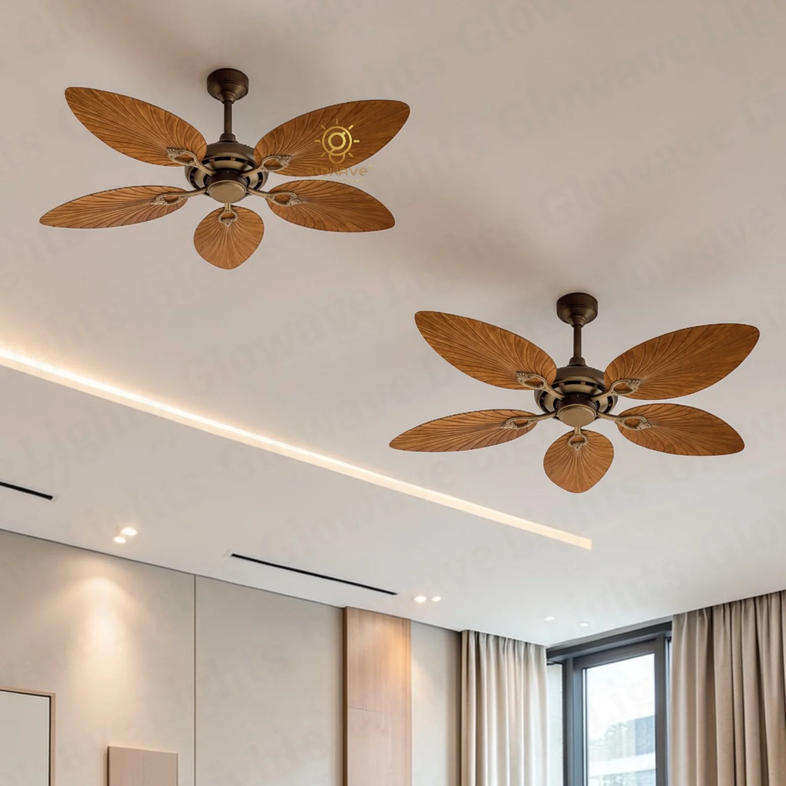 Transform your space into a serene retreat with this beautifully crafted tropical leaf ceiling fan, designed to blend elegance with functionality. Featuring intricately carved wooden-finish blades inspired by natural palm leaves, this fan adds a warm, luxurious touch to any interior or semi-outdoor setting. The rich texture and detailed design make it a perfect statement piece for living rooms, bedrooms, balconies, or patios.