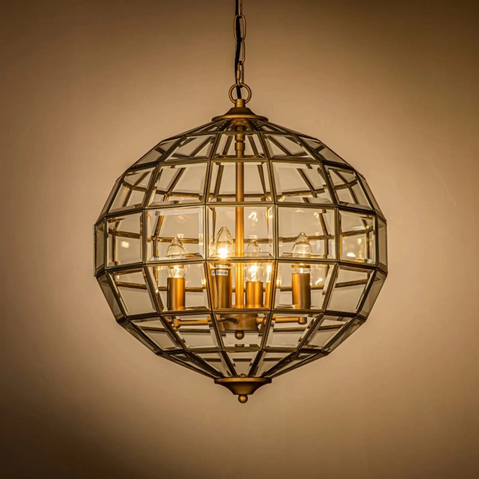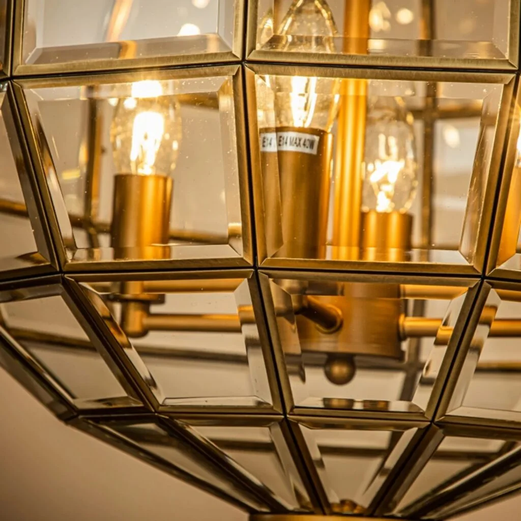 Enhance your interiors with this luxurious gold geometric glass chandelier, designed to bring a perfect blend of elegance and modern sophistication to your space. Featuring a beautifully crafted metal frame with a rich gold finish, this hanging light showcases a multi-panel glass cage design that creates a stunning visual appeal while allowing light to radiate evenly in all directions.