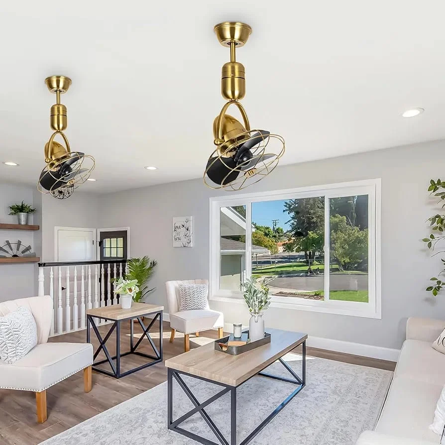 This modern wall-mounted fan combines efficient airflow with a stylish industrial design. Featuring a premium gold finish and durable metal safety cage, it adds a decorative touch while providing reliable cooling for your space. The adjustable head design allows you to easily direct airflow where it is needed, improving comfort and air circulation in the room. Built with a smooth and quiet motor, this fan is suitable for everyday use in living rooms, bedrooms, offices, cafés, and restaurants.